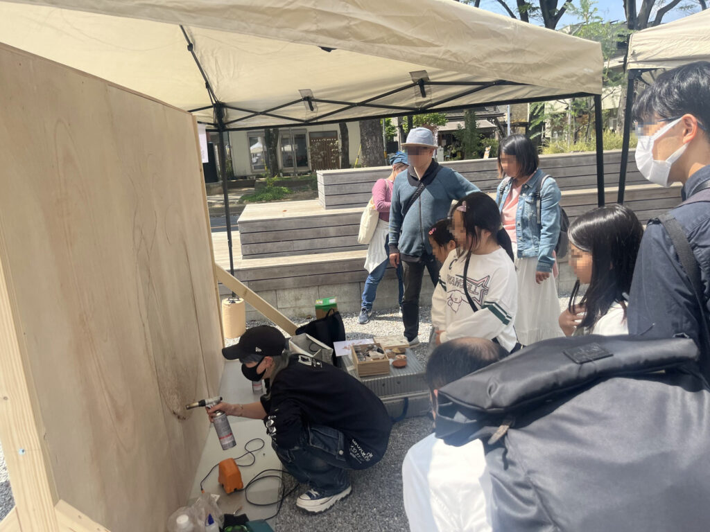 会場内で大きな壁面パネルにいっせいに絵を描いていきます。